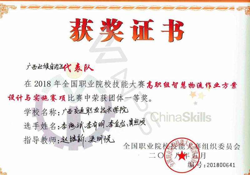 (管理工程系讯蒋波、梁玥悦/文)5月13日下午,2018年全国职业院校技能大赛高职组“中诺思杯”智慧物流作业方案设计与实施比赛在天津交通职业学院圆满结束。来自全国各省、自治区、直辖市和新疆生产建设兵团的58支参赛代表队共计232名参赛选手展开了激烈角逐。我院管理工程系李海斌、李金龙、李有明、黄照顺四名同学组成的参赛队在比赛中本着精益求精的“工匠精神”,沉着应战,出色发挥,最终脱颖而出,以全国第五的优异成绩斩获大赛一等奖。