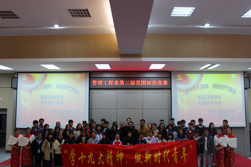 【管理工程系讯甘青梅、梁玥悦/文 全永权/图】12月17日,在系党总支统筹安排下,“学十九大精神,做新时代青年”第三届学生党团知识竞赛在四塘校区综合教学楼C2学术报告厅举行。系党总支宣传委员、系团总支书记蒋波、学生第二党支部书记耿兴云、党员教师陈争、甘青梅、刘鸿雁、梁文到场观看比赛。