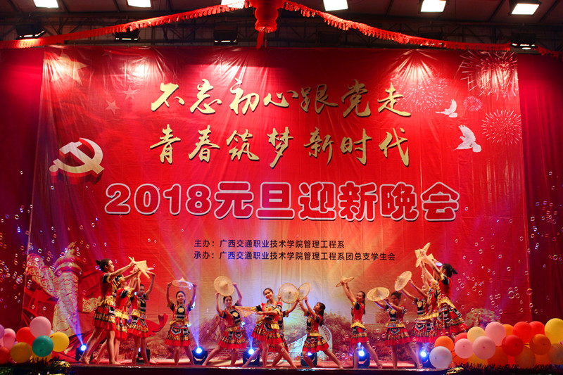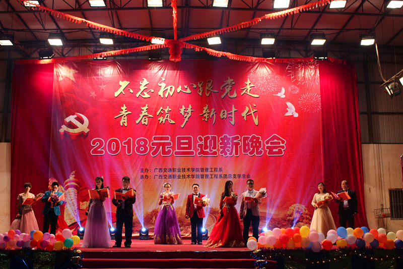 晚会在青春靓丽、动感十足的啦啦操表演中拉开帷幕。党总支书记龙建强介绍当晚出席的领导和嘉宾,系主任郝林毅致新年贺词。本场晚会节目精彩纷呈。青春动感的现代舞,婉约唯美的民族舞,神采飞扬的职业礼仪展示,饱含深情的吉他弹唱,幽默搞笑的小品,赢得台下观众的热烈掌声。副主任李钊、曹斌领衔的党员教师主题朗诵《在中国大地上的报道》将整台晚会推向高潮,慷慨激昂的朗诵声中,道出了党的十八大以来砥砺奋进的五年所取得的辉煌成就,表达在党的十九大的精神指引下,青春筑梦新时代的壮志雄心。
