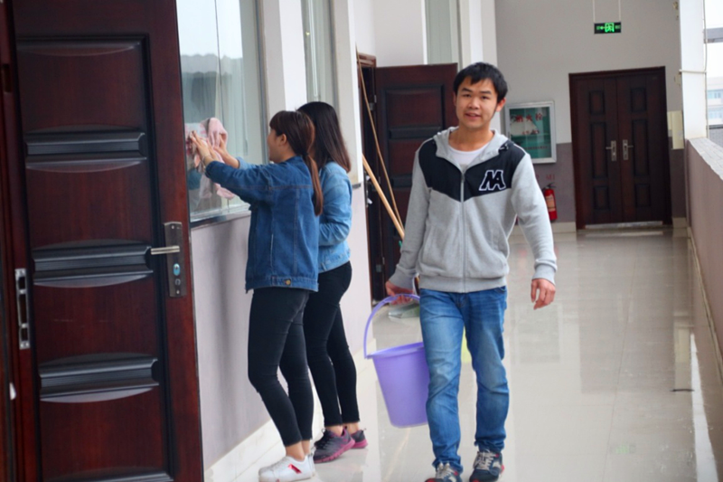 当天,虽然天气湿冷,但同学们仍怀着温暖的心积极投身到活动中来。同学们分成若干小组,分散到各个实训室中去,拿起手中的扫把、抹布等清洁工具,迅速行动起来。有擦桌子的,有扫地的,有清理蜘蛛网的,大家合理分工,相互配合。同学们忙碌着,说笑着,气氛很欢乐,不一会儿,整洁干净的实训室便呈现在眼前。