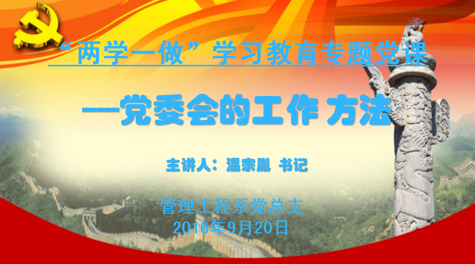 2016年9月20日下午15:30,学院党委温宗胤书记深入管理工程系党总支,为全体党员主讲题为《党委会的工作方法》的专题党课。温书记结合党的辉煌历程和红色革命传统,以丰富生动的事例,为广大党员讲授了一堂厚重精彩的专题党课。