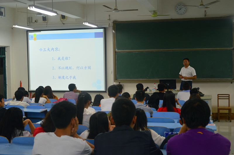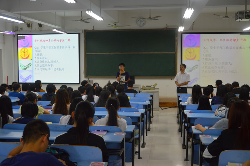 本次培训活动由系党总支负责人龙建强副书记牵头组织,2014级、2015级学生干部分场次进行。此次培训共设两个专题内容,一是由龙建强书记主讲《如何成为一名合格的学生干部》;二是由蒋波老师主讲《让制度见证我们的点滴成长》。龙书记的讲座轻松愉悦、幽默风趣而富有深度。他首先从著名心理学家马斯洛的需要层次理论入手,深入揭示了“我为什么要做学生干部”的深刻内涵,追根溯源,从根本上激发学生干部工作的内源动力和工作热情。然后,引证一些鲜活案例,阐述了学生干部工作的基本要求和方法路径,明确学生干部能力和素质要求,帮助学生干部找方法、寻对策。最后,通过互动环节让学生干部讲述实际工作中遇到的困惑和棘手问题,然后对症下药,一一进行有针对性的解答。培训课堂气氛活跃,不时响起阵阵掌声。蒋波老师主要从《大学生综合素质考核办法》入手,阐述了良性制度对促进学生成长成才的重要性,并且鲜明指出学生干部要做学校制度的忠实贯彻者和坚决执行者,值周班干要担好班站好岗,严格考核结果“一周一汇报”、“一月一通报”、“一学期一总结”的工作要求,以高度负责的态度切实发挥《大学生综合素质考核办法》学期考核、过程培养的重要作用。
