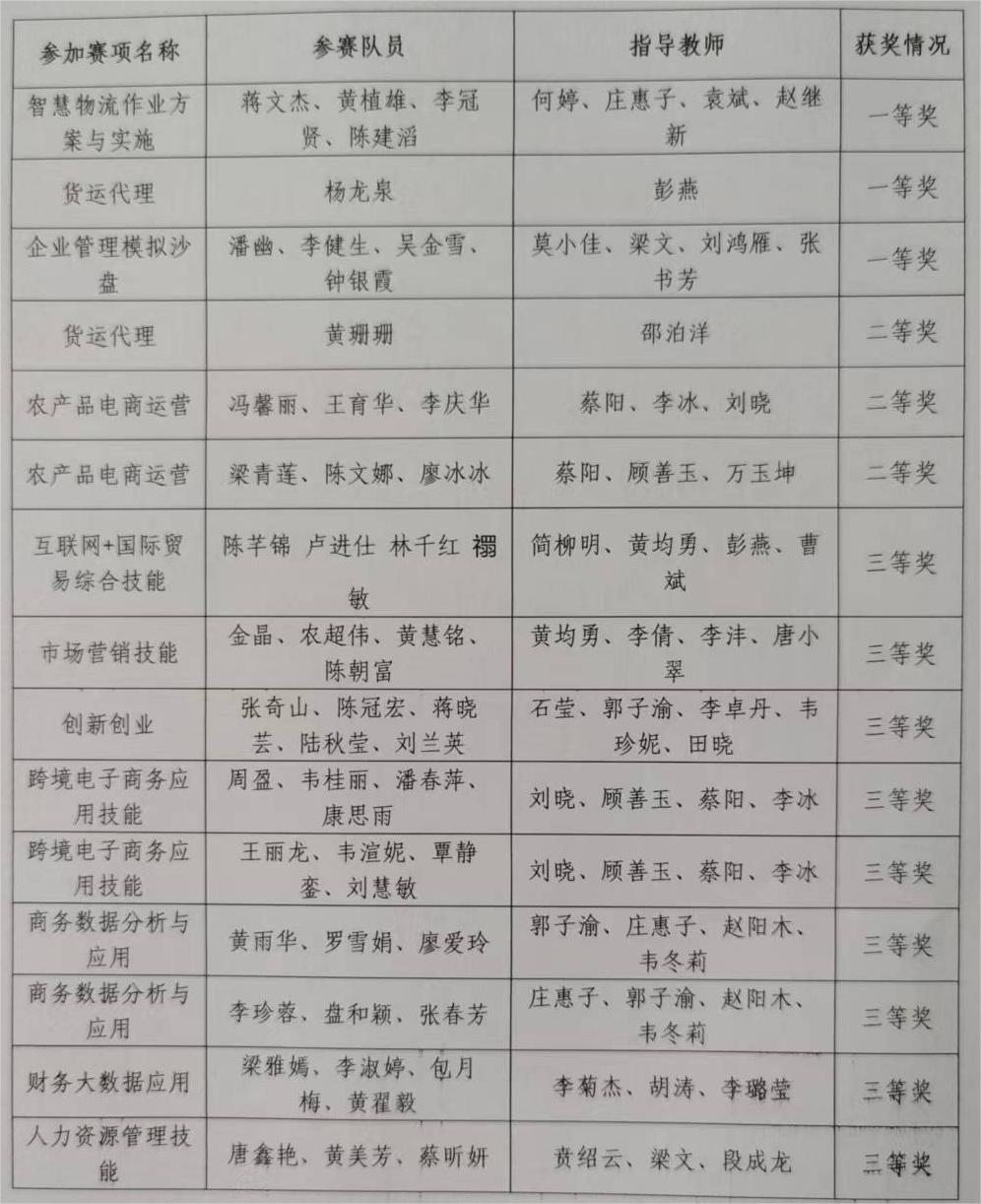 在刚刚结束的2023年广西职业院校技能竞赛中,我院师生秉持学校“定必干 干必成 成必优”的精神风貌,以“勇担当 善拼搏 攀高峰”的饱满精神状态,斩获一等奖3项,二等奖4项,三等奖8项的好成绩,用实际行动为学校“国双职本”贡献经管力量。