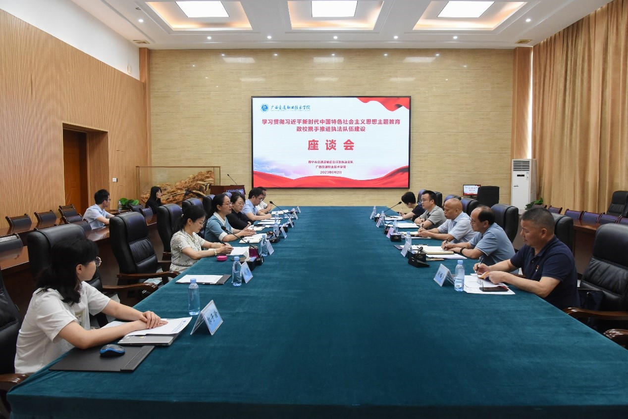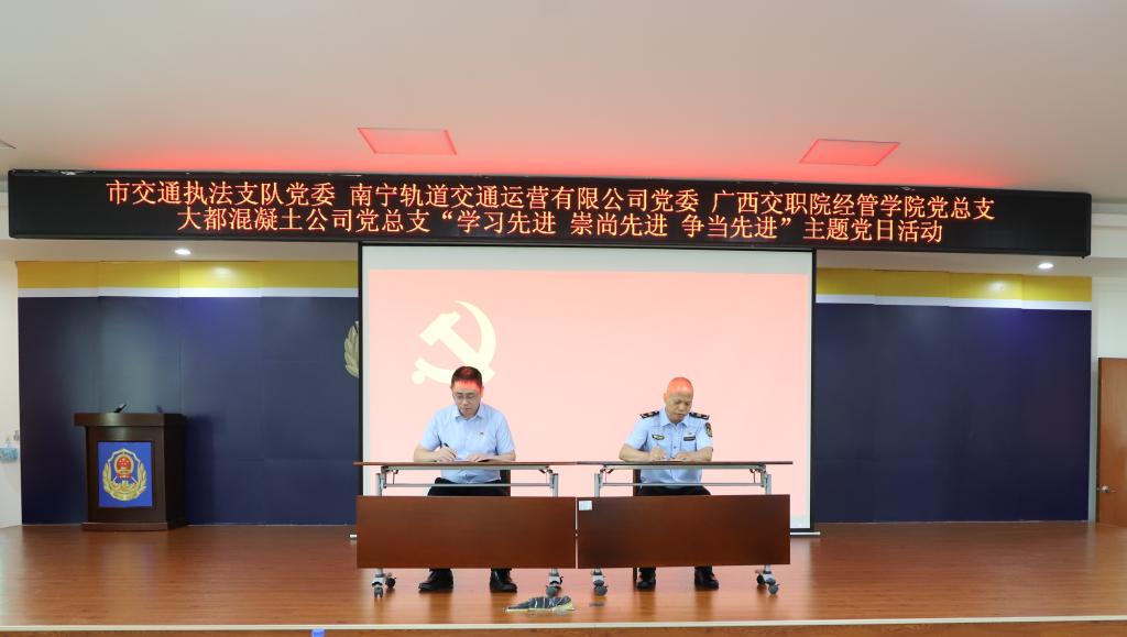 在“七一”党的生日来临之际,为庆祝中国共产党成立102周年,深入学习贯彻习近平新时代中国特色社会主义思想,全面贯彻落实党的二十大精神,6月28日上午,经济管理学院党总支书记曹斌带队赴南宁市交通运输综合行政执法支队签订党建结对共建协议。南宁市交通运输综合行政执法支队党委书记李向东出席会议。此次活动是落实我校与南宁市交通运输综合执法支队政校合作座谈会党建共建共识的落地之举。