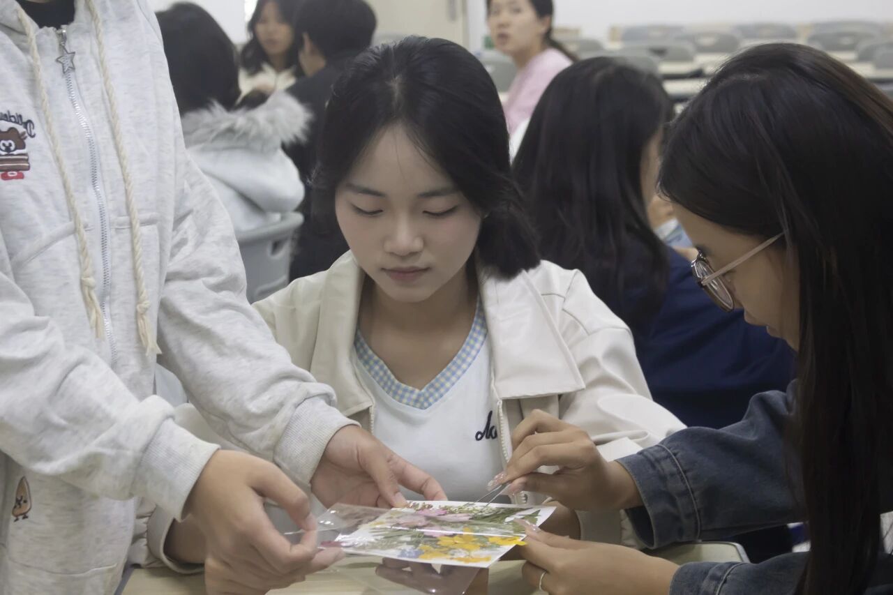 人力2025-1王同学说:“今天特别感谢学院组织的‘秋拾花语’活动!破冰时的轻松互动、制作书签时的专注协作,让我很快和新同学熟络起来。选花、搭配的过程特别治愈,听着工作人员讲干花寓意和心理小知识,入学的焦虑慢慢消散了。拿着亲手做的书签和大家合影,真切感受到了校园的温暖,也更期待接下来的大学生活了!”