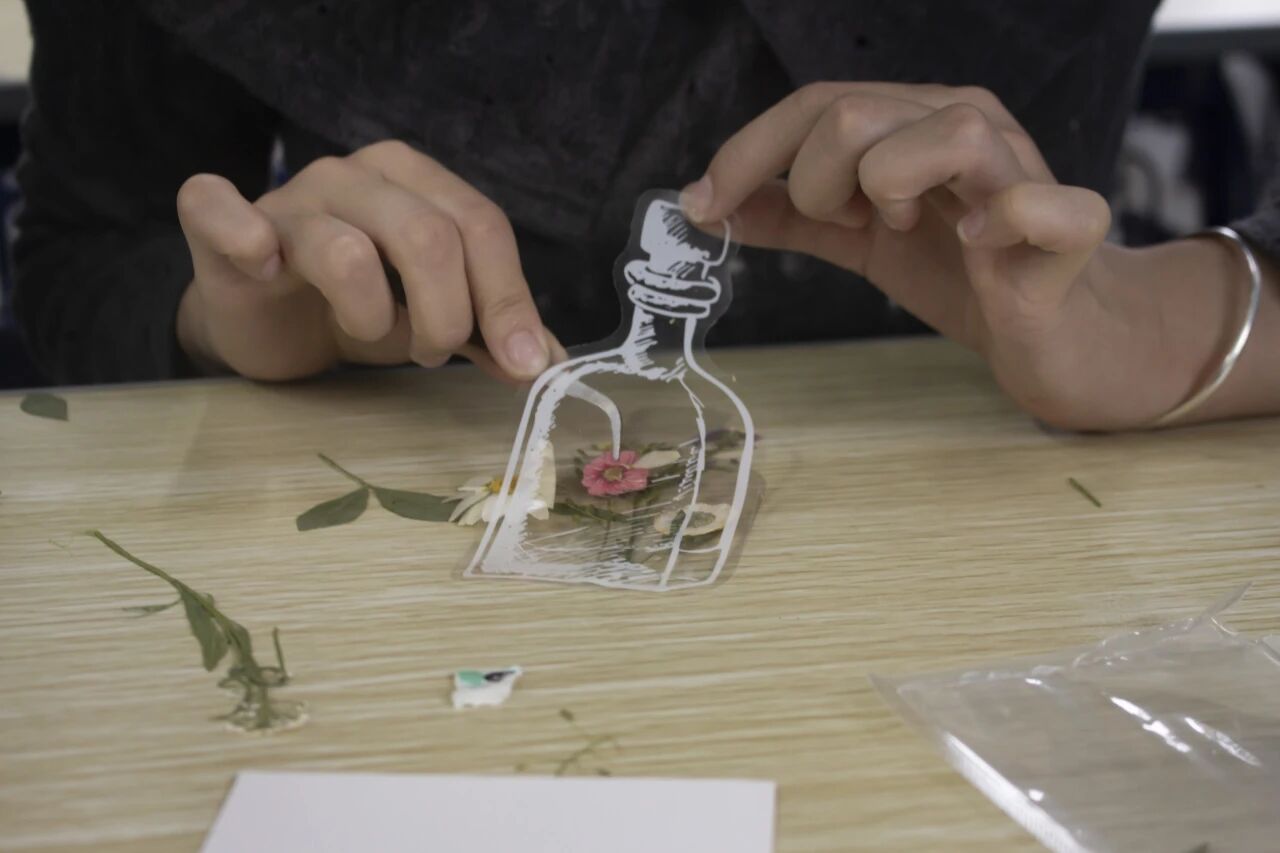 专注手作,情绪流动。制作环节中,同学们以4-5人为一组协同创作,大家精心挑选花材、细心布局构图。镊子轻夹,流苏垂落,原本零散的花叶在透明书签中定格成画。过程中,组员间自然交流选花原因、分享想探索的校园角落,陌生感在协作中悄然消融。