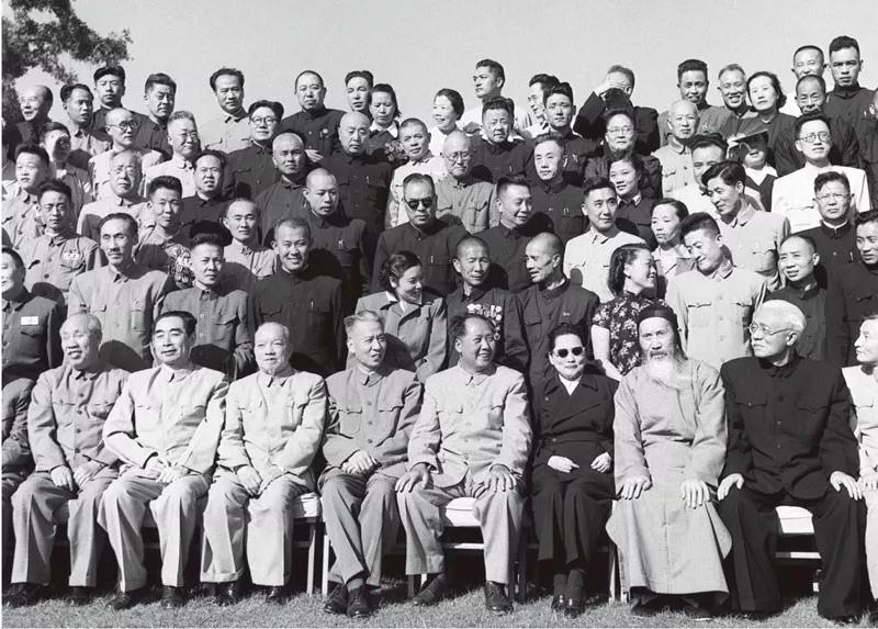 中华人民共和国第一届全国人民代表大会第一次会议全体代表于1954年9月21日合影。毛泽东主席和代表们在一起。前排左起:董必武、