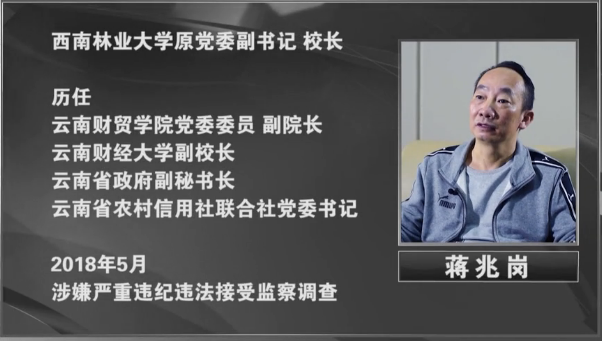 蒋兆岗历任云南财经大学副校长、云南省政府副秘书长、云南省农村信用社联合社党委书记、西南林业大学党委副书记、校长等职务。2018年5月11日,云南省公安厅发布了全国首例应监委要求的A级通缉令,对蒋兆岗进行通缉。20天后,蒋兆岗被抓获归案。