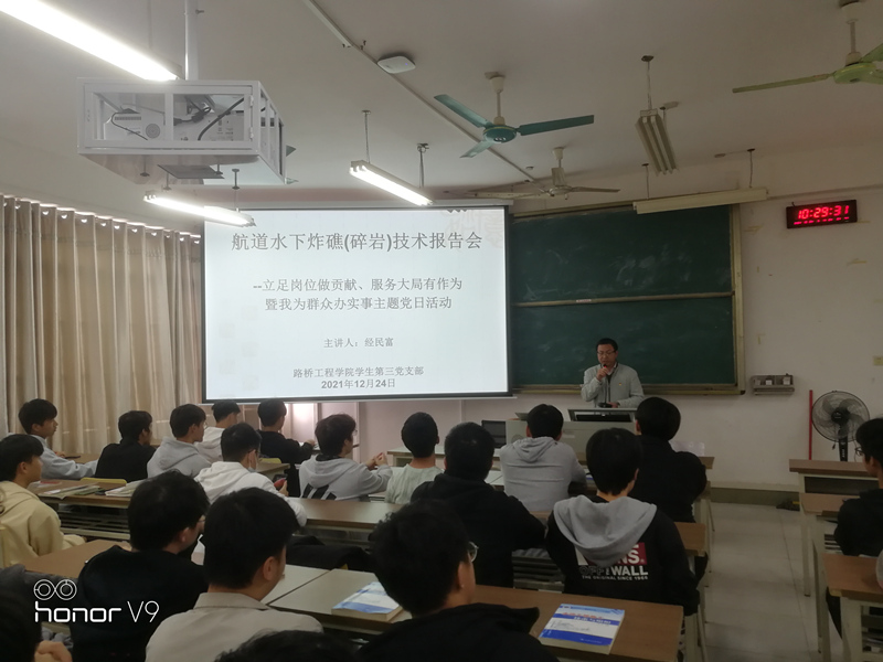 (路桥学院讯 覃思尧/文图)为深入学习贯彻党史学习教育要求,深刻领会党史学习教育意义,践行立足岗位做贡献、服务大局有作为的理念,落实我为群众办实事要求,2021年12月24日上午,路桥工程学院学生第三党支部以党的十九大、十九届一中、二中、三中、四中、五中、六中精神和习近平新时代中国特色社会主义思想为指导开展“我为群众办实事”主题党日活动—举行《航道水下炸礁(碎岩)技术报告会》为港口2020级和2021级同学作报告,会议由支部书记经民富主持。
