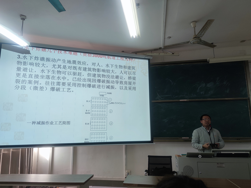 经书记以广西作为交通强国试点省(自治区)之一和西部陆海新通道的主要参与者作为切入口,结合西江航道贵港到梧州3000吨级航道工程的建设实际以及我校承担的《贵梧3000吨航道工程炸礁施工振动对桥梁危害机制研究及安全性评价》项目来展开,并针对港口专业的特点以及对未来的展望进行详细介绍,报告主要包括贵梧3000吨级航道工程简介、航道水下炸礁(碎岩)技术简介、水下炸礁(碎岩)几个技术难题(以贵梧3000吨航道工程为例)和航道建设水下炸礁(碎岩)技术新进展。