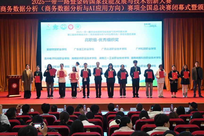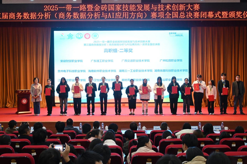 10月26日,2025一带一路暨金砖国家技能发展与技术创新大赛之第三届商务数据分析(商务数据分析与AI应用方向)赛项全国总决赛在山东圆满落幕。我院智慧运输管理团队派出的赵泓逸、莫经玉、王艳同学,凭借扎实的专业能力斩获全国二等奖。同时,我校获评优秀组织奖,指导教师郭子渝、胡明方获评优秀指导教师奖。