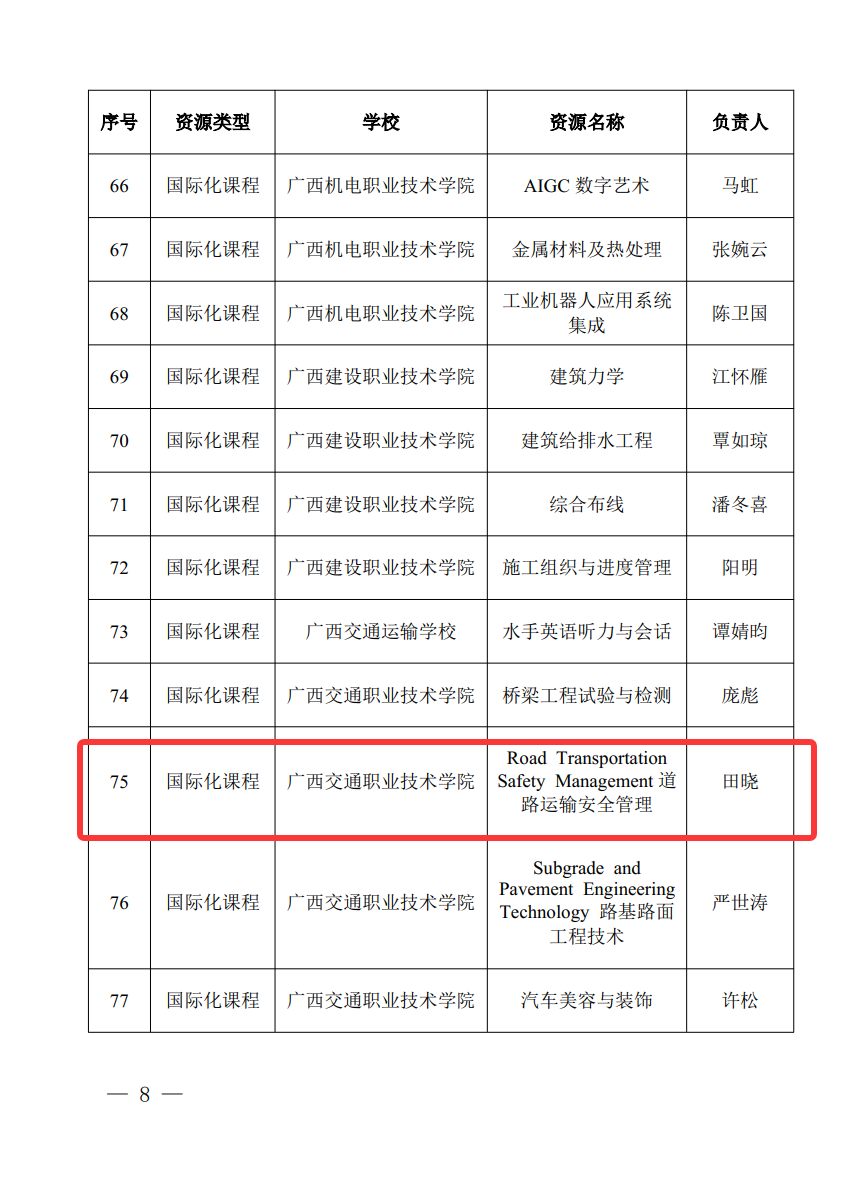 近日,广西壮族自治区教育厅公布2025年面向东盟国际化职业教育资源认定结果,我院智慧运输团队申报的《Road Transportation Safety Management(道路运输安全管理)》成功入选自治区级面向东盟国际化课程,为中国—东盟职业教育开放合作再添实践成果。
