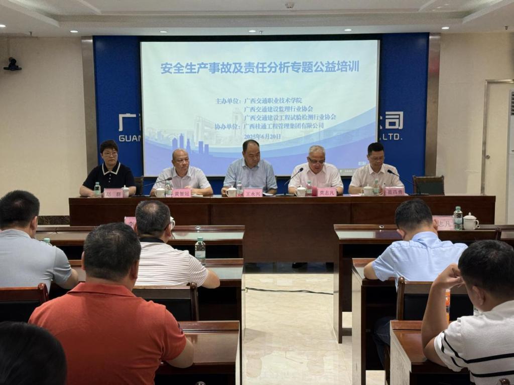 2025年6月20日,安全生产事故及责任分析专题公益培训在邕举行。本次培训由广西交通职业技术学院联合广西交通建设监理行业协会、广西交通建设工程试验检测行业协会主办,桂通集团协办。来自广西交通建设的500多名从业人员通过上线下相结合的形式参加了本次培训。