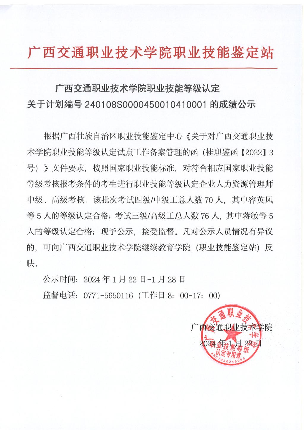 20240108广西交通职业技术学院第25批企业人力资源管理师成绩公示
