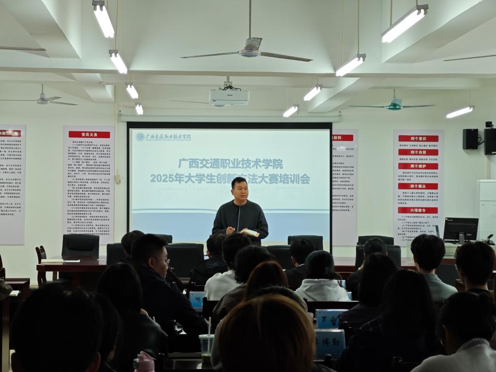 2025年广西大学生创新方法大赛由自治区科协主办,以“培育创新人才,服务产业发展”为主题,涵盖发明制作、工艺改进、创新设计等多个类别,着力推动创新方法与产业实际需求深度融合。培训中,黄健老师系统解读了赛事规则与评审标准,重点介绍了TRIZ创新理论在交通领域的应用,并结合我校以往获奖作品--“智慧港航监测装置”“新能源汽车节能组件”等典型案例,深入讲解了创新方案设计、申报书撰写、现场答辩等关键环节。