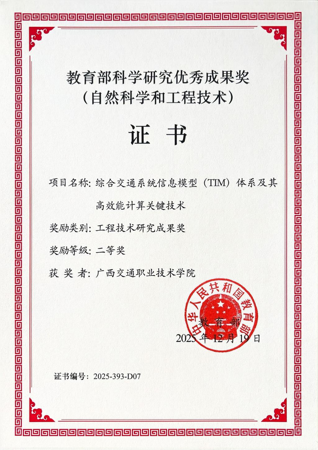 12月19日,教育部公布了2025年教育部科学研究优秀成果奖(自然科学和工程技术)授奖项目名单,我校参与完成的项目《综合交通系统信息模型(IIIMI)体系及其高效能计算关键技术》获工程技术研究成果奖二等奖,该项目由东南大学牵头,我校在项目完成过程中对创新点1、3项有重要贡献,这也是学校建校以来首次荣获教育部科学研究优秀成果奖。