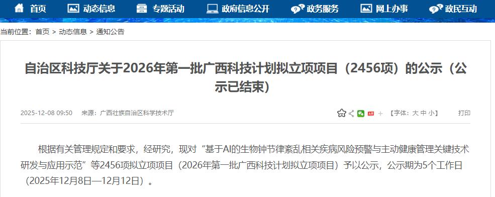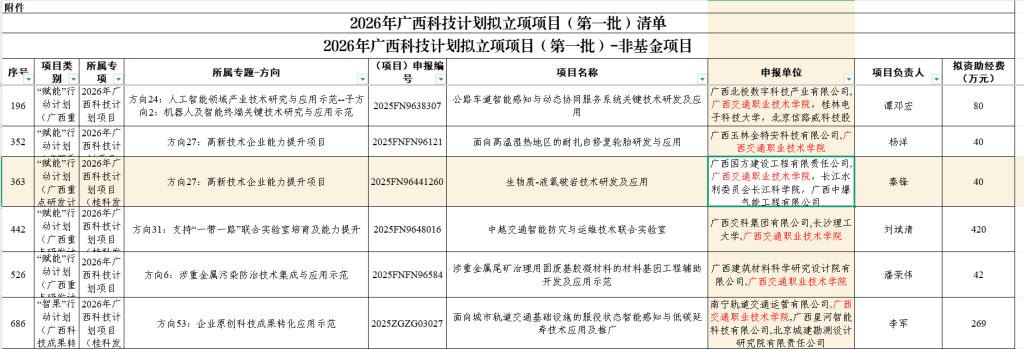 12月13日,广西壮族自治区科学技术厅官网结束了2026年第一批广西科技计划拟立项项目清单公示,学校共成功入选9个,助力科技创新领域发展再上新台阶!此次获批的项目涵盖“赋能”行动计划、“智果”行动计划及自然科学基金三大类别,其中非基金项目学校承担6项,并牵头承担2项自然科学基金面上项目并以第二单位参与1项,全面展现了学校在科技成果转化应用及产学研跨协同创新、基础研究等领域的战略布局。