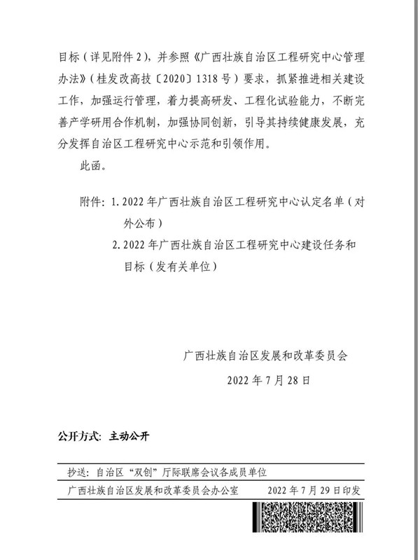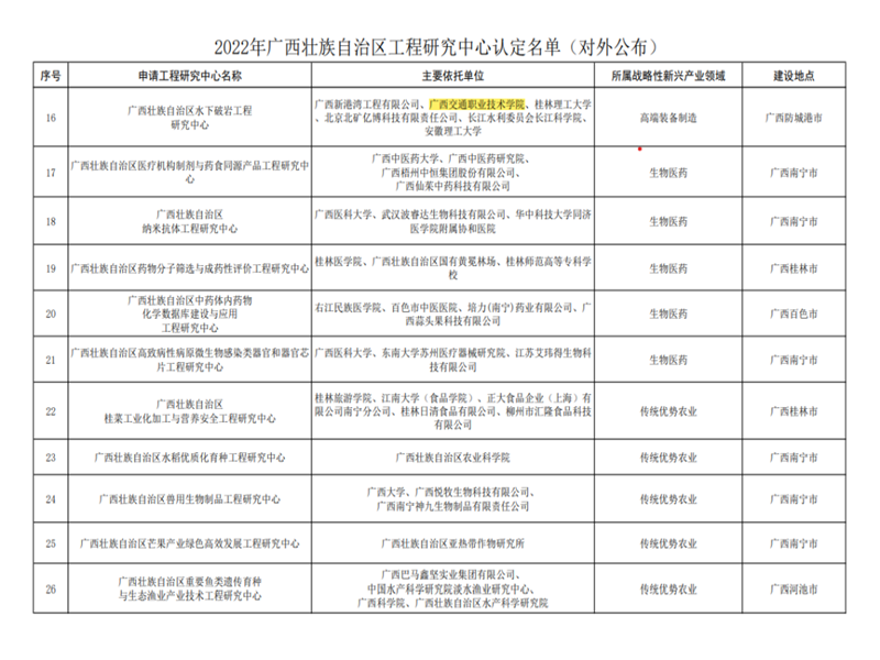 近日,广西壮族自治区发展和改革委员会公布了《广西壮族自治区发展和改革委员会关于认定2022年度广西壮族自治区工程研究中心的函》(桂发改高技函〔2022〕2312 号),由我校路桥工程学院联合申报的“广西壮族自治区水下破岩工程研究中心”获得认定建设,这是我校继“自治区公路隧道安全预警工程研究中心”后在科研平台建设的又一项重大突破。