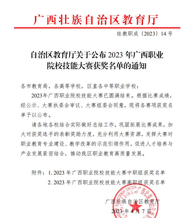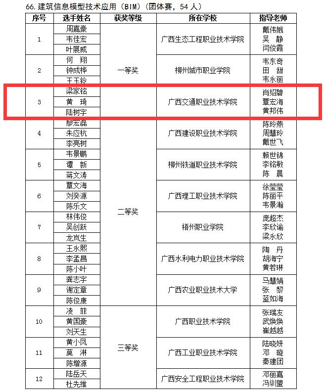 3月18-19日,由自治区教育厅主办,我校承办的2023年广西职业院校技能大赛高职组建筑信息模型技术应用(BIM)赛项落下帷幕。全区共21支高职院校代表队参与此次角逐。由我院肖绍碧、覃宏海、黄邦伟老师指导的梁家铭、黄琦、陆树宇三名同学经过认真备赛,喜获自治区级团体一等奖。