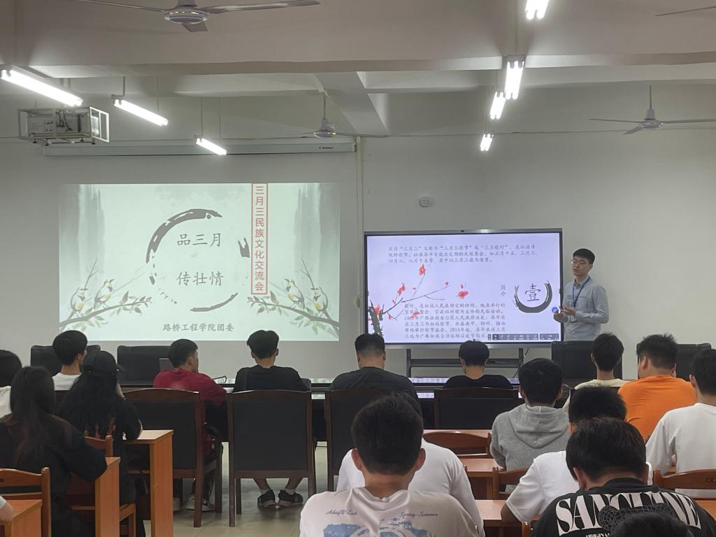 近日,路桥工程学院团委学生会张溯老师组织学生在学院519会议室开展三月三民族文化交流会主题团日活动,围绕民族传统文化进行开展, 进一步推进铸牢中华民族共同体意识,促进学生了解中华民族传统文化,增强文化自信,鼓励学生积极了解地方非物质文化遗产,传承优秀传统文化。