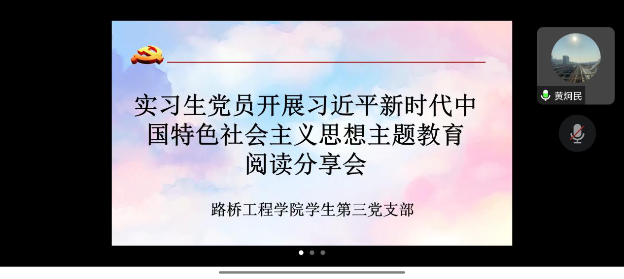 (路桥讯)为深入开展学习贯彻习近平新时代中国特色社会主义思想主题教育,帮助学生解决急难愁盼问题。近期,学生第三党支部组织校外实习的学生党员、预备党员和校内入党积极分子开展专题党课、读书分享活动,灵活采用线上+线下的方式进行,促进学生第三党支部主题教育入脑入心入行。