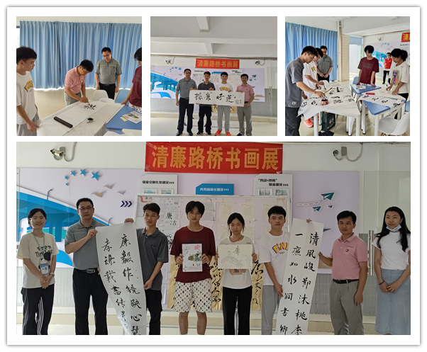 随后,韦志清副院长与我院老师一行到“清廉路桥”书画展活动现场参观指导。我院将清廉情怀与艺术作品相结合,借以启示全体师生应有洁身自好的人生态度,保持从容清醒的定力和埋头苦干的意志,在履职尽责中荡清风、扬清气、守清廉。罗纯(道桥2021-6班)、滕振凯(轨道2021-3班)、廖孝杰(轨道2022-3班)与林诗涵(道路造价2021-7班)四位同学坦言“通过学院此次书画展,让我们能品鉴中国传统文化中的清廉情节,能畅谈直抵心灵深处的清廉感悟,能挥洒翰墨书香的清廉情怀,能收获来自身边的感动与感悟。”韦副院长、李副书记与四名同学共同执笔挥墨,合力完成了一副清廉书画佳作,更是在建设“清廉交院”之路上,携手扬正气,同沐廉洁风。