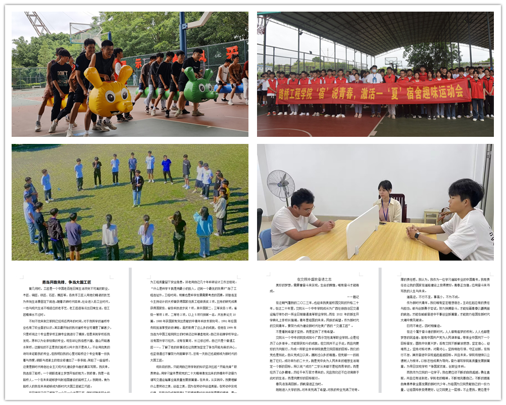 据悉,自去年起,我院启动了“一院一品”宿舍文化建设活动,去年举行了多场活动,活动参与程度火爆,参与人次达两千余人,今年我院继往开来,本学期已逐项举办了“勇当开路先锋,争当大国工匠”学生征文比赛”、“不负好春光,指路'心'力量”学生公寓心理沙龙、“'宿'说青春,激活一‘夏’”宿舍趣味运动会,活动参与学生人数达八百多人,通过活动收益人次达两千五百多人次,取得了较为丰厚的宿舍育人成效。接下来,我院还将持续进一步夯实“一站式”学生社区建设,凝练凸显路桥特色的宿舍品牌,进一步推动思政元素与宿舍育人阵地建设相融合,进一步推动学院“三全育人”综合改革成效,进一步助推学校取得“双高”建设的圆满胜利!