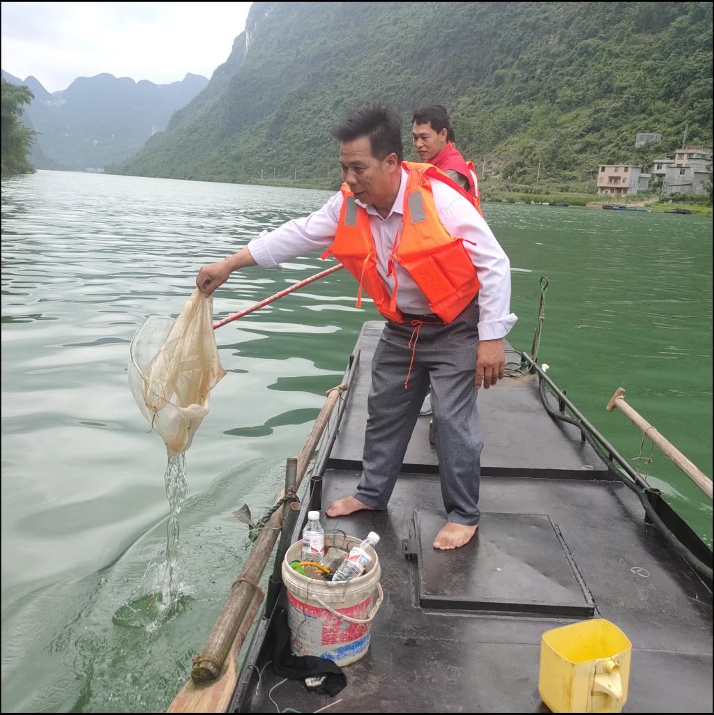 (图为党员们在红水河拉若屯流域清理水面垃圾)