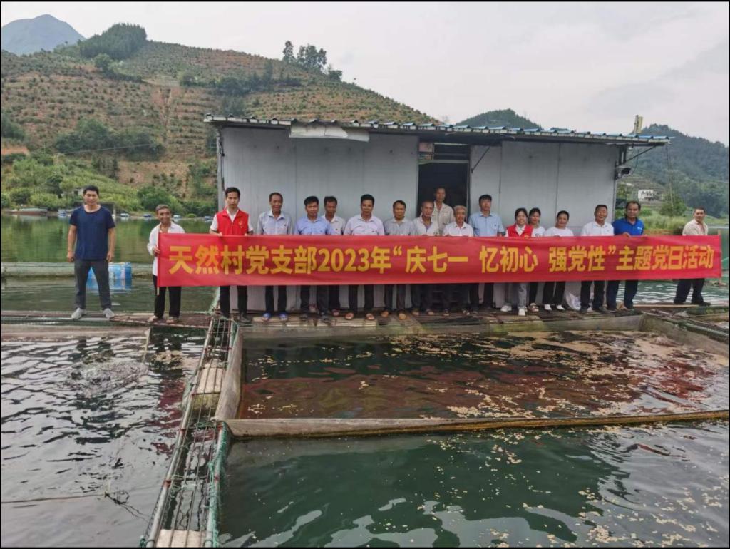(图为党员们参观天然村在信河湖参与投资的网箱养殖基地)