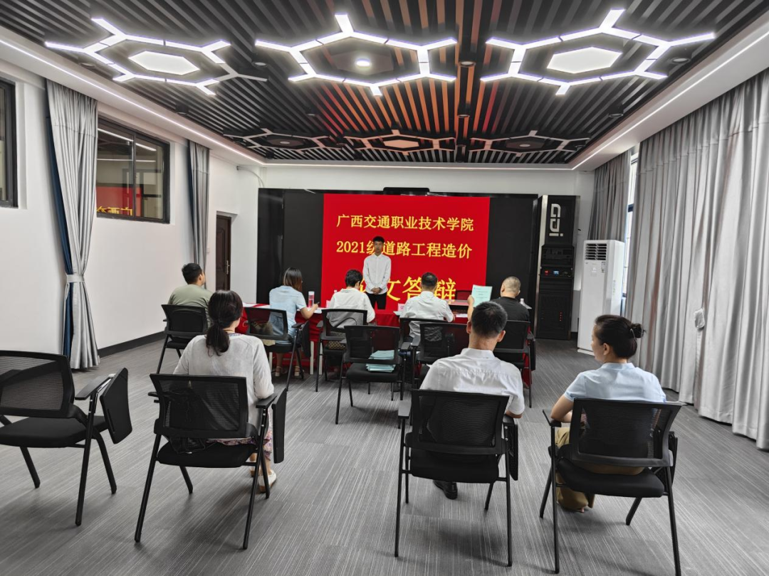 7月10日,我校联合办学点广西交通技师学院的QJ道造2021班举行《专业综合训练》现场答辩会。路桥工程学院蔡广聪副院长、工程管理系丁永灿主任及教学干事梁彩芬老师出席答辩会。