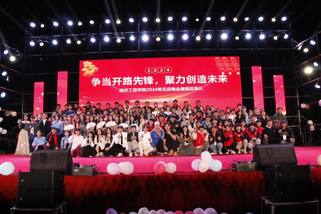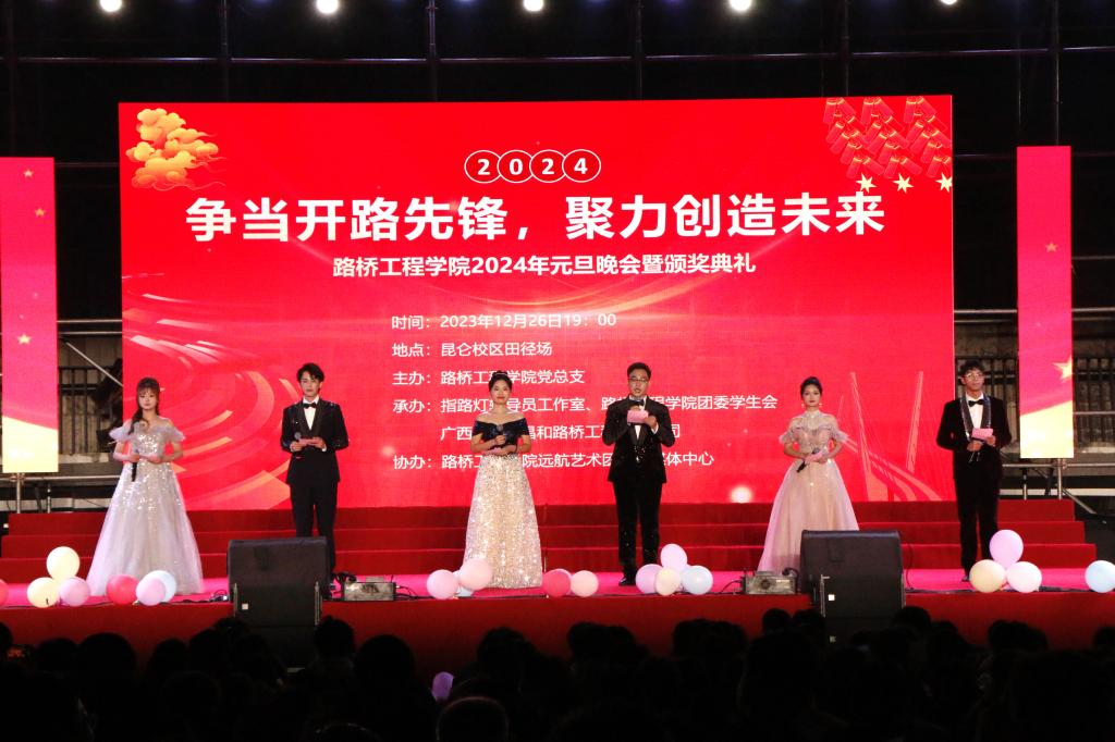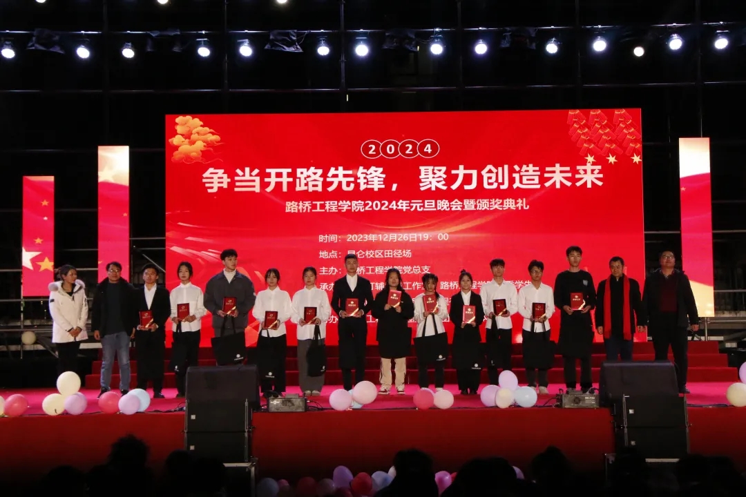 (路桥讯)岁聿云暮,一元复始。为迎接2024年元旦的到来,表彰过去一年为学院在双高建设、清廉路桥建设等方面取得优异成绩的师生,12月26日晚,路桥工程学院“争当开路先锋·聚力创造未来”2024年元旦晚会暨颁奖典礼在昆仑校区田径场成功举办。学校党委宣传部、学生工作部、团委、招生就业处、科技与对外合作部、体育教学部等职能部门和教学部的相关负责人与学院全体师生欢聚一堂,迎接新年到来。