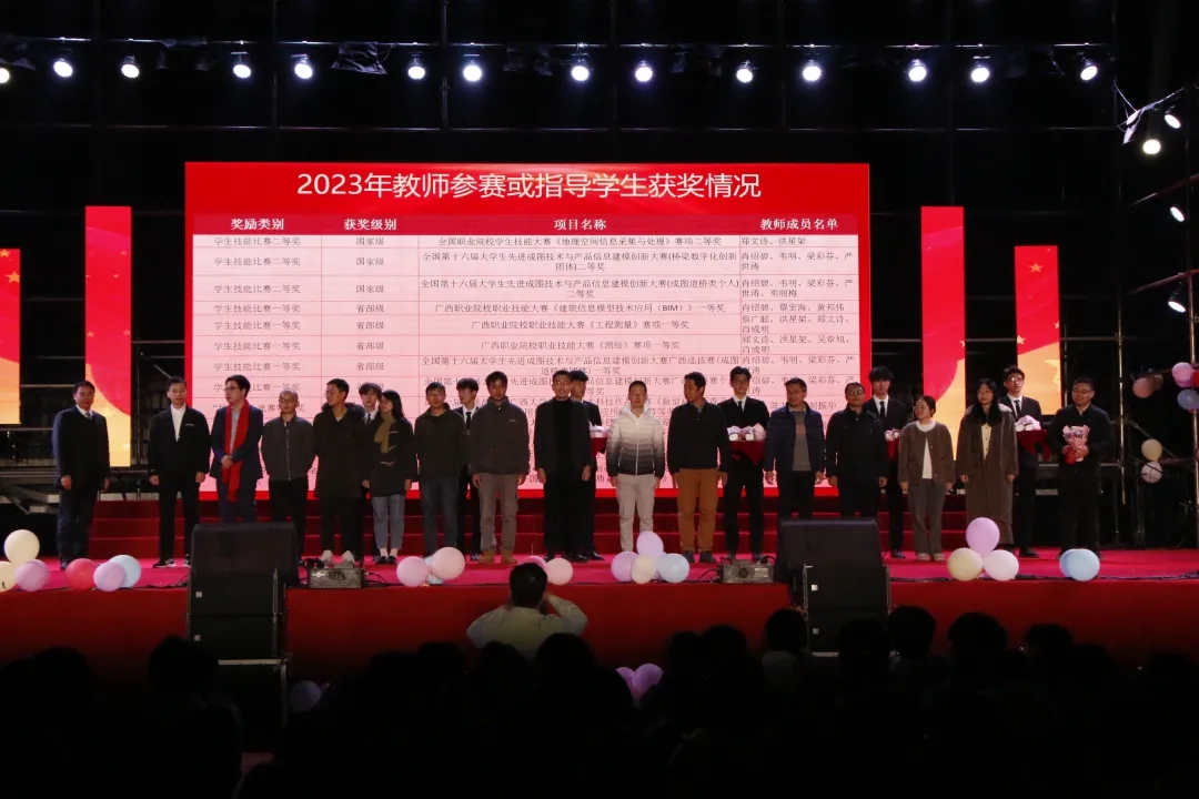 晚会上,学院领导班子成员与学校相关职能部门负责人为过去一年在教师职业技能比赛、 科研工作、指导学生比赛等方面获奖的老师和学生职业技能比赛、双创比赛、国家、自治区奖学金等方面获奖的同学进行颁奖。