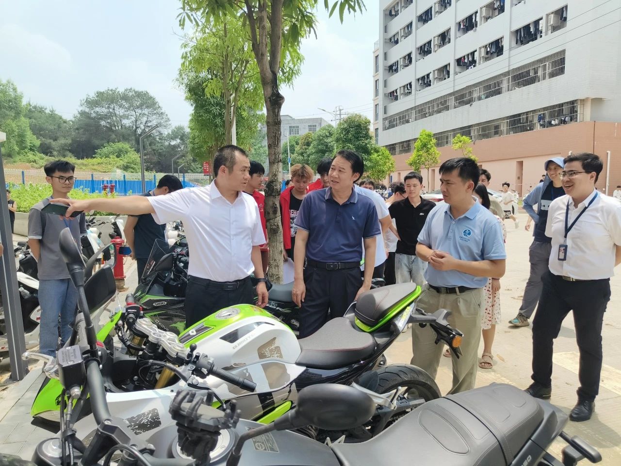 在东区21栋宿舍周边的车辆停放区,莫院长和韦书记与摩托车、电单车驾驶员亲切交谈,叮嘱他们遵守校园交通要求,并传达学校对校园车辆的管理要求:学生车辆在校园禁止通行,我们要共同维护校园的交通安全。