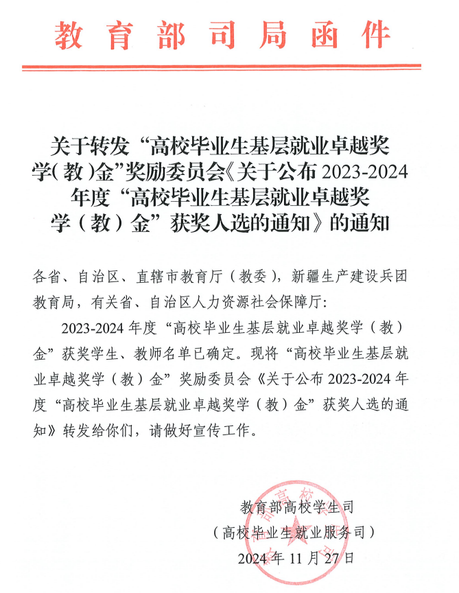 此次获奖,是继我院优秀毕业生赵俊智荣获“全国基层就业卓越奖”后,再度获此殊荣,不仅是对黄文华多年基层工作卓越表现的表彰嘉奖,也是对学院就业育人工作的高度肯定。学院始终高度重视就业育人导向作用,充分宣传基层就业政策、不断加大就业典型选树宣传力度、切实顺畅毕业生就业通道,积极引导学生到西部、到基层、到国家最需要的地方建功立业。下一步,学院将持续推进基层政策性岗位相关工作走实走深,鼓励更多毕业生扎根基层,积极主动服务国家战略需求,把个人理想追求融入党和国家事业之中,将自己的青春热血挥洒在基层一线。