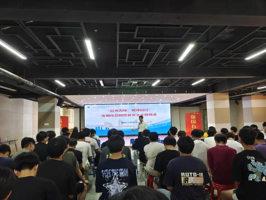 活动伊始,蔡广聪副院长在东区 9-12 栋青年活动中心主持召开首场文明作息和饮食安全主题活动的动员讲话。会上,他结合学生日常作息与饮食现状,强调规律作息对学业发展和身心健康的重要性,同时通过案例分析食品安全隐患,号召同学们从自身做起,以实际行动践行文明作息以及安全就餐等文明公约。