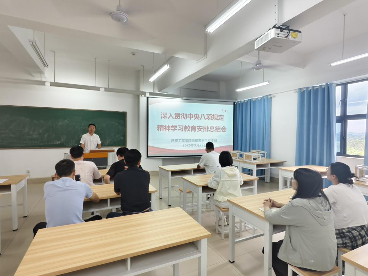 (路桥讯)9月30日,路桥工程学院党总支在路桥大楼会议室召开深入贯彻中央八项规定精神学习教育总结会,会议传达学习了习近平总书记关于深入贯彻中央八项规定精神学习教育的重要讲话和指示精神,以及中央、自治区党委党的建设工作领导小组会议精神,并对学院学习教育工作情况进行总结,对推进作风建设常态化长效化工作进行研究部署。学院党总支书记韦秋平主持会议并讲话。