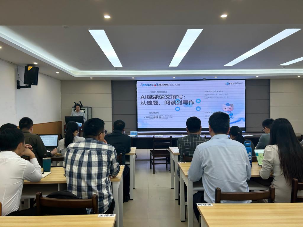 在技术宣讲环节,中国知网广西分公司大客户经理包桂萍女士作了《AI赋能论文撰写:从选题、阅读到写作》的专题报告。她详细演示了如何利用AI工具高效完成文献筛选、思路梳理和内容润色,为师生们提供了从选题到成稿的全流程智能化解决方案,现场答疑与操作演示气氛热烈。