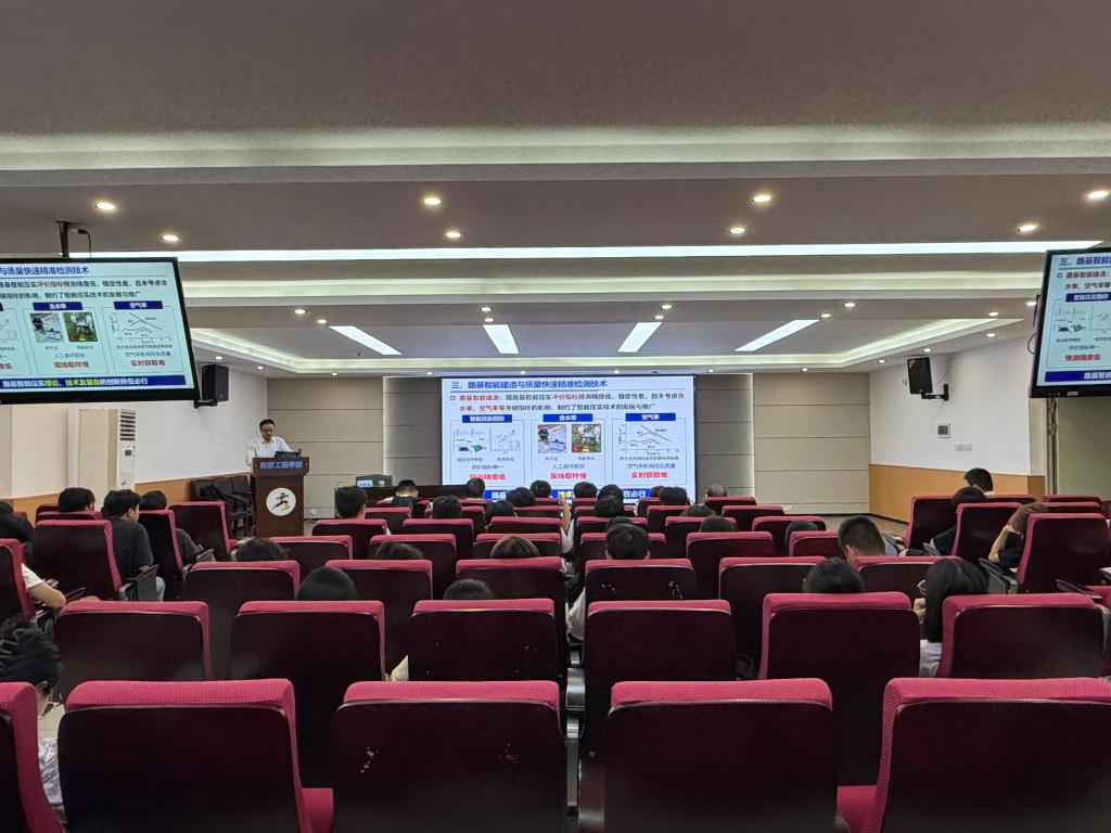 讲座中,崔新壮教授围绕着路基建设难题,重点分享了智能化核心技术成果。在路基变形监测领域,详细介绍了团队研发的智能新型监测设备,该设备突破传统监测局限,可实现对路基深层位移、应力变化等关键数据的精准捕捉,并通过构建“路基内外联动变形监测系统”,实时传输、分析监测数据,为路基安全预警提供科学依据。针对施工过程管控,崔教授提出融合人工智能、物联网、大数据的智能技术方案,通过搭建数字化施工平台,对路基填料配比、压实度控制等关键环节进行动态调控,有效提升施工效率与工程质量,助力路基建造向“智能化”转型,相关科技成果可应用于广西平陆运河等工程建设中。