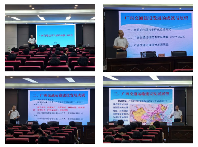 在宣讲中,黎明同志围绕主题分三部分展开。他首先解读交通的内涵与运输形式,强调“交通是经济社会发展的血脉”,并结合公路、铁路、水运、航空等实际案例,如南宁国际铁路港推动跨境贸易、北部湾港联通东南亚,生动说明了多种运输方式的协同作用。其次,在介绍广西交通建设成就时,他结合亲身经历,从“县县通高速”到高铁网络加密、西江干线升级,借助详实的数据与案例,清晰展现了广西交通从“瓶颈制约”到“通达八方”的跨越发展。最后,展望未来,他聚焦“交通强国”战略下的广西机遇,分析智慧交通、绿色交通等趋势,鼓励新生夯实专业基础,未来在交通智能化、跨境物流通道建设等领域贡献力量。
