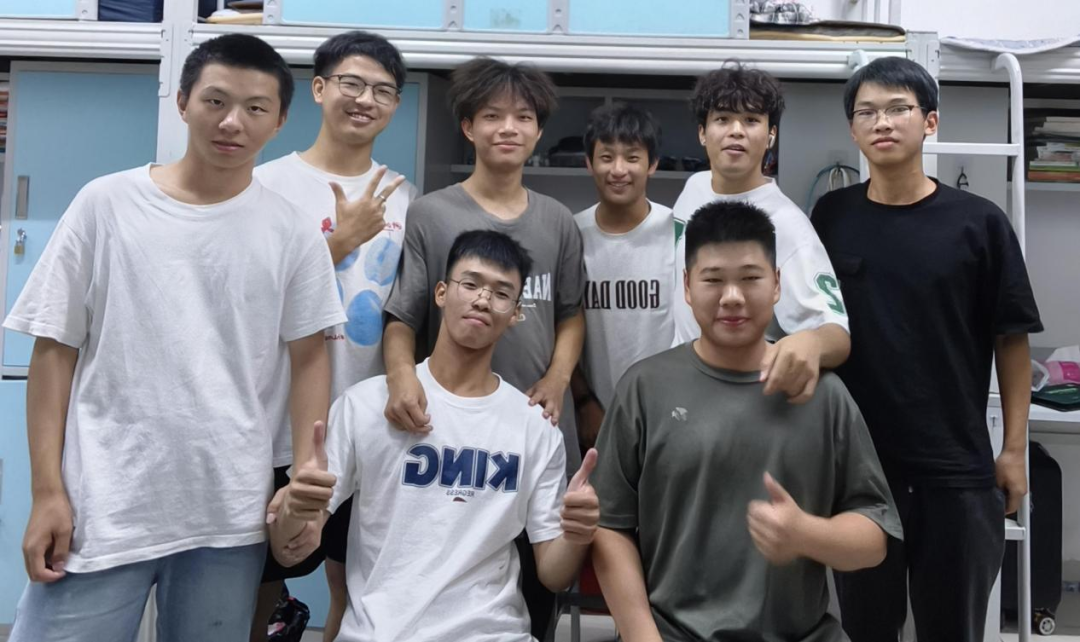 宿舍里,我们八个穿着休闲,或站或坐,面带笑意、姿态放松,有的比手势、有的竖拇指,满是青春活力与同窗情谊。