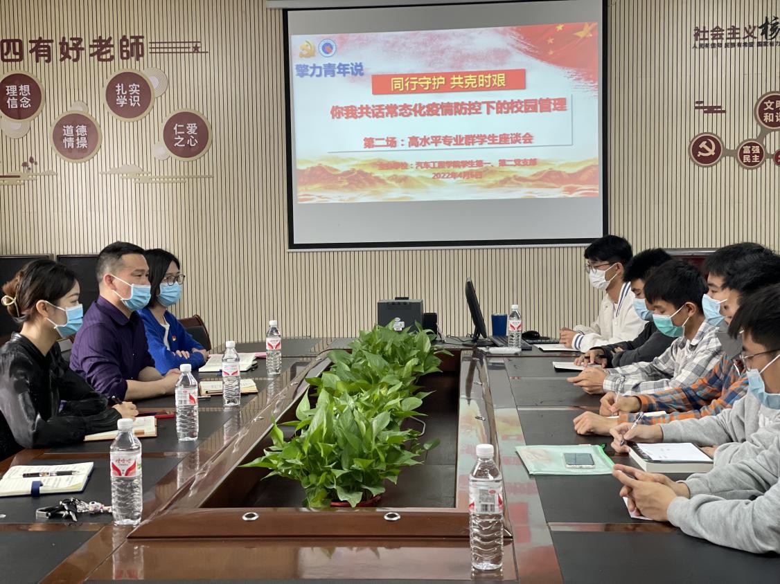 (汽车工程学院 讯 季卉婕 王杰身/文)2022年4月6日,汽车工程学院你我共话常态化疫情防控下的校园管理第二场座谈会,在汽车楼404会议有序开展,本次主要与高水平专业群学生代表面对面深入坦诚的思想对话交流。座谈会邀请到汽车工程学院谢军副院长、学校心理中心关文莉老师、汽车工程学院张露尹老师参加。座谈会由张露尹老师主持。