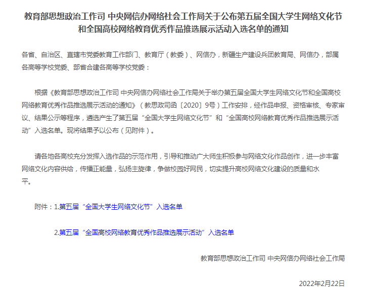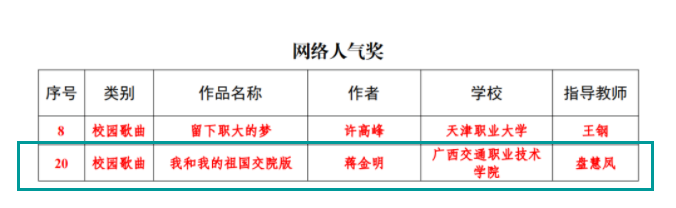 (汽车工程学院 讯 梁业灿/文)根据《教育部思想政治工作司 中央网信办网络社会工作局关于举办第五届全国大学生网络文化节和全国高校网络教育优秀作品推选展示活动的通知》(教思政司函〔2020〕9号)公布,经作品申报、资格审核、专家审议、结果公示等程序,遴选产生了第五届“全国大学生网络文化节”入选名单。我院蒋金明提交的校园歌曲《我和我的祖国交院版》荣获网络人气奖。