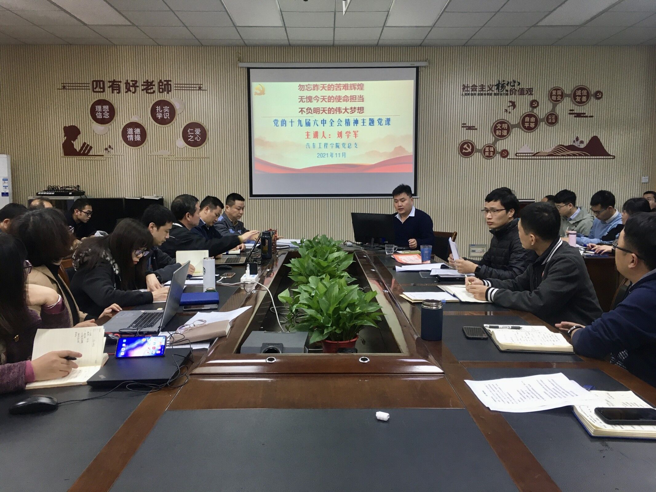 (汽车工程学院 讯 王清华/文)11月8日至11日,中国共产党第十九届中央委员会第六次全体会议在北京举行。中共中央总书记习近平作了重要讲话,全会审议通过了《中共中央关于党的百年奋斗重大成就和历史经验的决议》和《关于召开党的第二十次全国代表大会的决议》。这场会议引起我院全体师生的广泛关注,迅速掀起学习贯彻党的十九届六中全会精神热潮,以集中学习、观看视频等多种方式,深入学习全会精神。