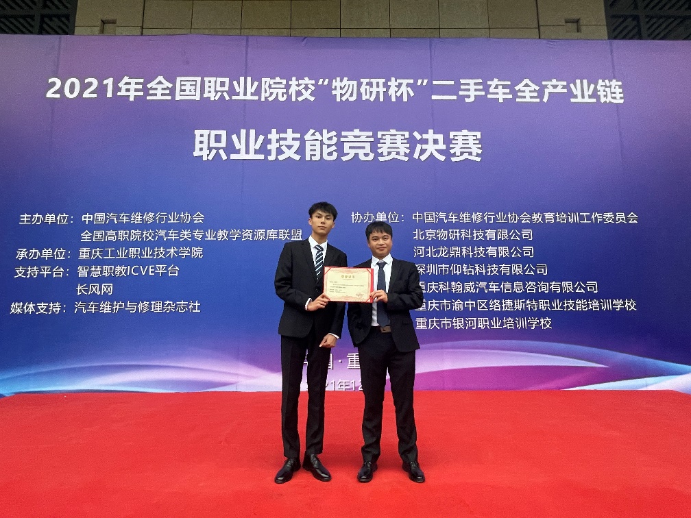 (汽车工程学院 讯 穆建宗、梁业灿/文)2021年12月12日,全国职业院校“物研杯”二手车全产业链职业技能竞赛在重庆举行,我院选派的2名学生李金桂、马宗成经过初赛和复赛的激烈角逐,在决赛上表现优秀,荣获高职组一等奖的好成绩。