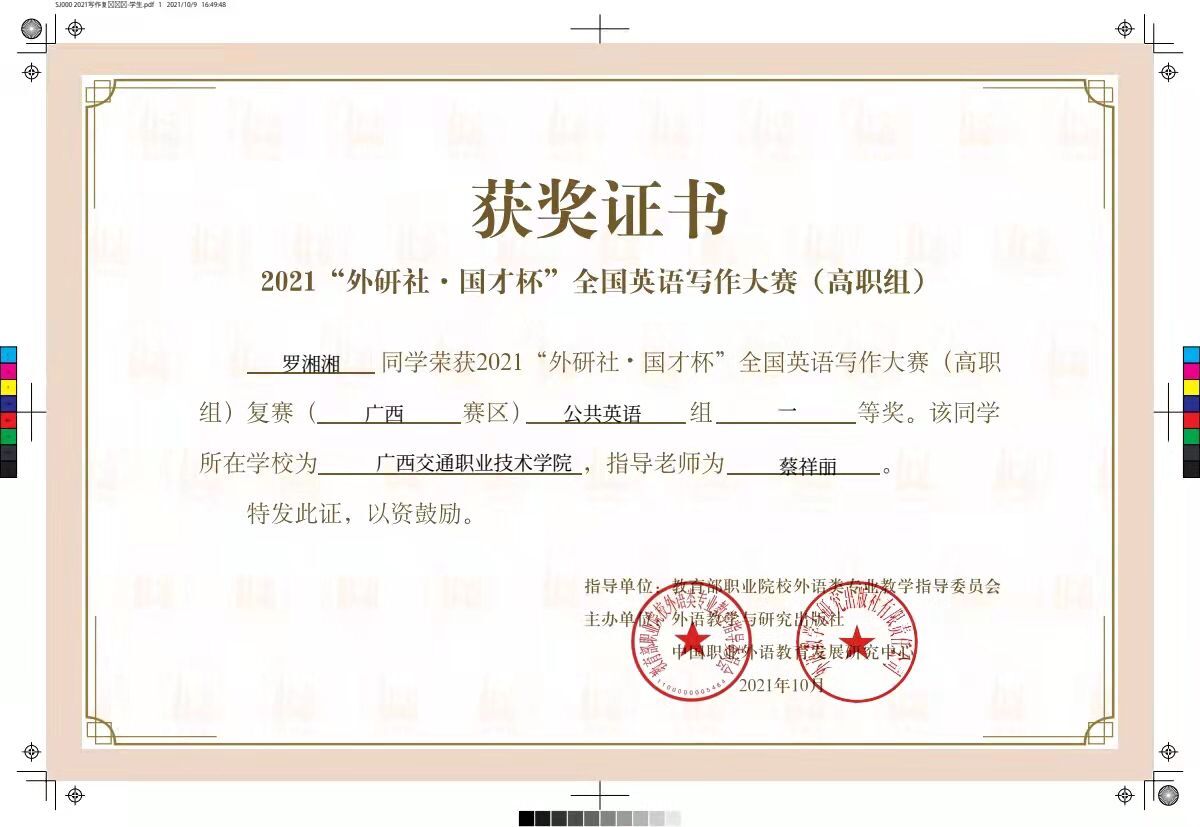 (汽车工程学院 讯 梁业灿、刘凤鸣/文)近日,2021“外研社·国才杯”全国英语演讲大赛广西区复赛于近期在线上举行,我院智能工程机械运用技术专业罗湘湘同学代表学校参与,喜获公共英语组一等奖,排名第一。据悉,本次来自20所高职院校的45名选手参加了广西区复赛,竞争激烈,罗湘湘同学顶住压力,正常发挥,最终获得一等奖。