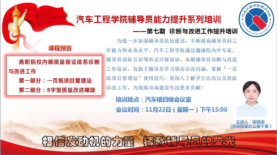 (汽车工程学院 讯 王杰身、刘凤鸣、季卉婕/文)为了全面推进学院内部质量保证体系诊断与改进工作,进一步加强我院辅导员队伍建设,不断提高辅导的理论知识水平和业务能力,促进辅导员朝着专业化、职业化发展。2021年11月22日,我院在汽车楼4楼会议室开展诊断与改进工作培训,由学校质量办覃晓涓老师主讲,汽车工程学院吴丹副书记主持会议,各辅导员参加会议。