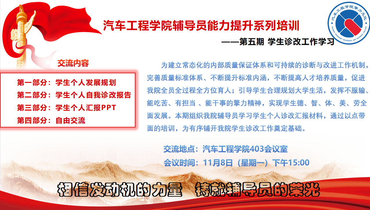 (汽车工程学院 讯 梁业灿 季卉婕/文)诊改工作是高职院校内部质量保证体系诊断与改进工作的简称,按照“需求导向、自我保证,多元诊断、重在改进”的工作方针,完善质量标准体系、不断提升标准内涵,不断提高人才培养质量,促进我院全员全过程全方位育人;引导学生合理规划大学生活,发挥不服输、能吃苦、有担当、能干事的擎力精神,实现学生德、智、体、美、劳全面发展。2021年11月8日,汽车工程学院将“学生诊改工作学习”作为辅导员专项培训的第五课,通过以点带面的培训,为有序开展我院学生诊改工作奠定基础。