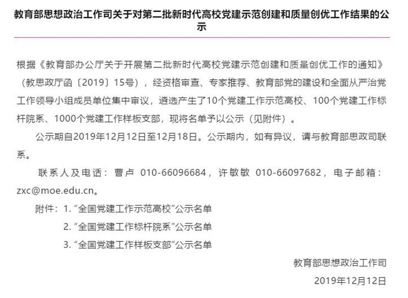 四、入选全国党建工作样板支部年12月,根据《教育部办公厅关于开展第二批新时代高校党建示范建设和质量创优工作的通知》(教思政厅函﹝2019﹞15号),经资格审查、专家推荐、教育部党的建设和全面从严治党工作领导小组成员单位集中审议,教育部思政司发布第二批“关于对新时代高校党建示范创建和质量创优工作评审结果的公示”,我院汽车工程系教工党支部入选“全国党建工作样板支部”。