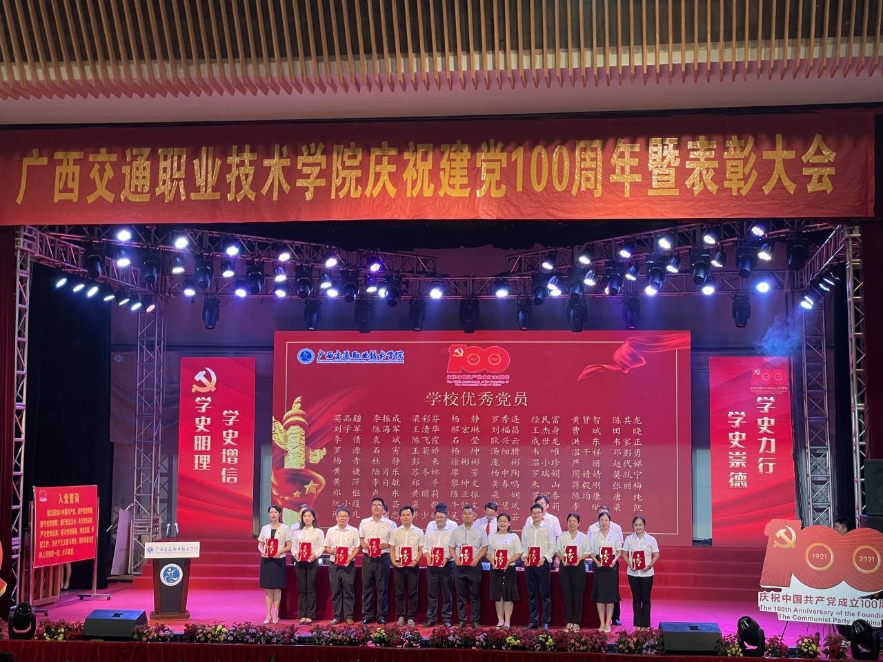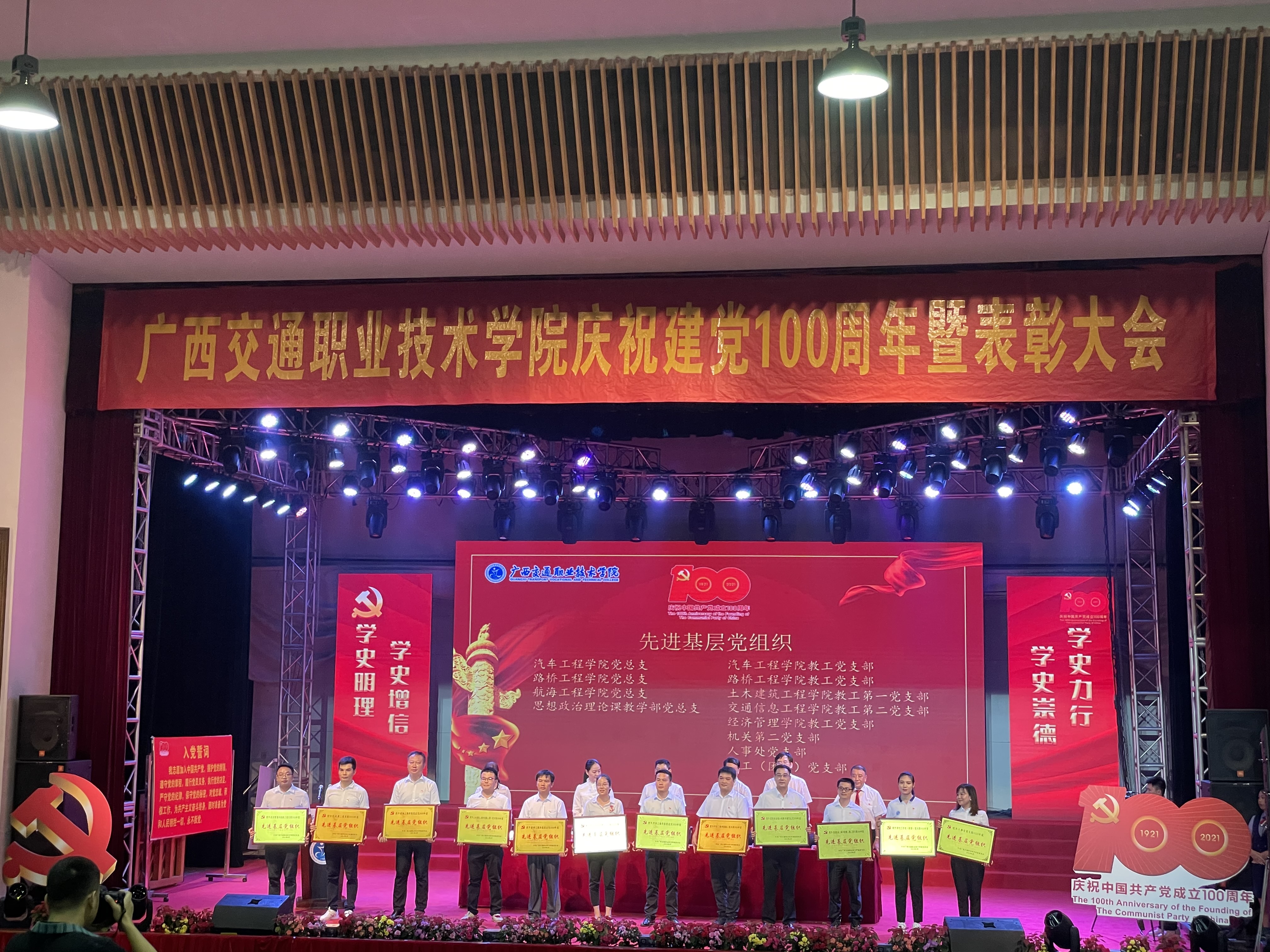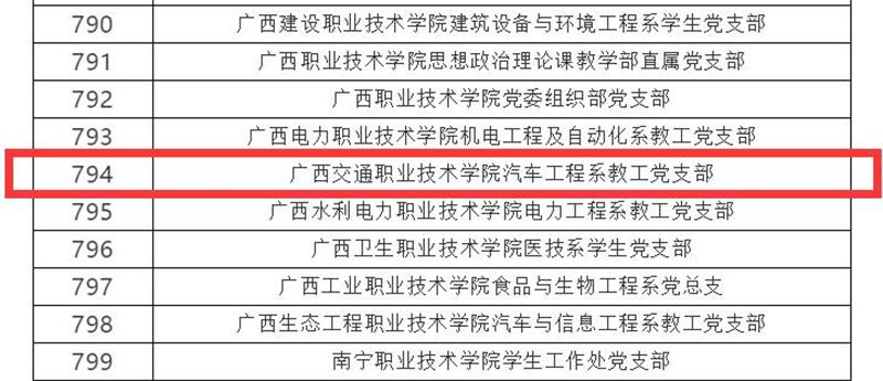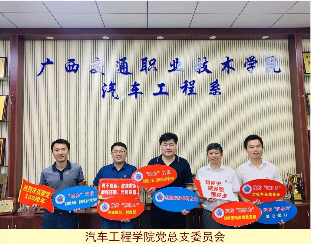 三、荣获学校先进基层党组织年6月30日,学校举行广西交通职业技术学院建党100周年表彰大会,汽车工程学院党总支和汽车工程学院教工第一党支部荣获“先进基层党组织”称号;吴丹、梁业灿荣获“优秀党务工作者”称号;刘学军、陈海军、王清华、解宏琳、王杰身荣获“优秀共产党员”称号。