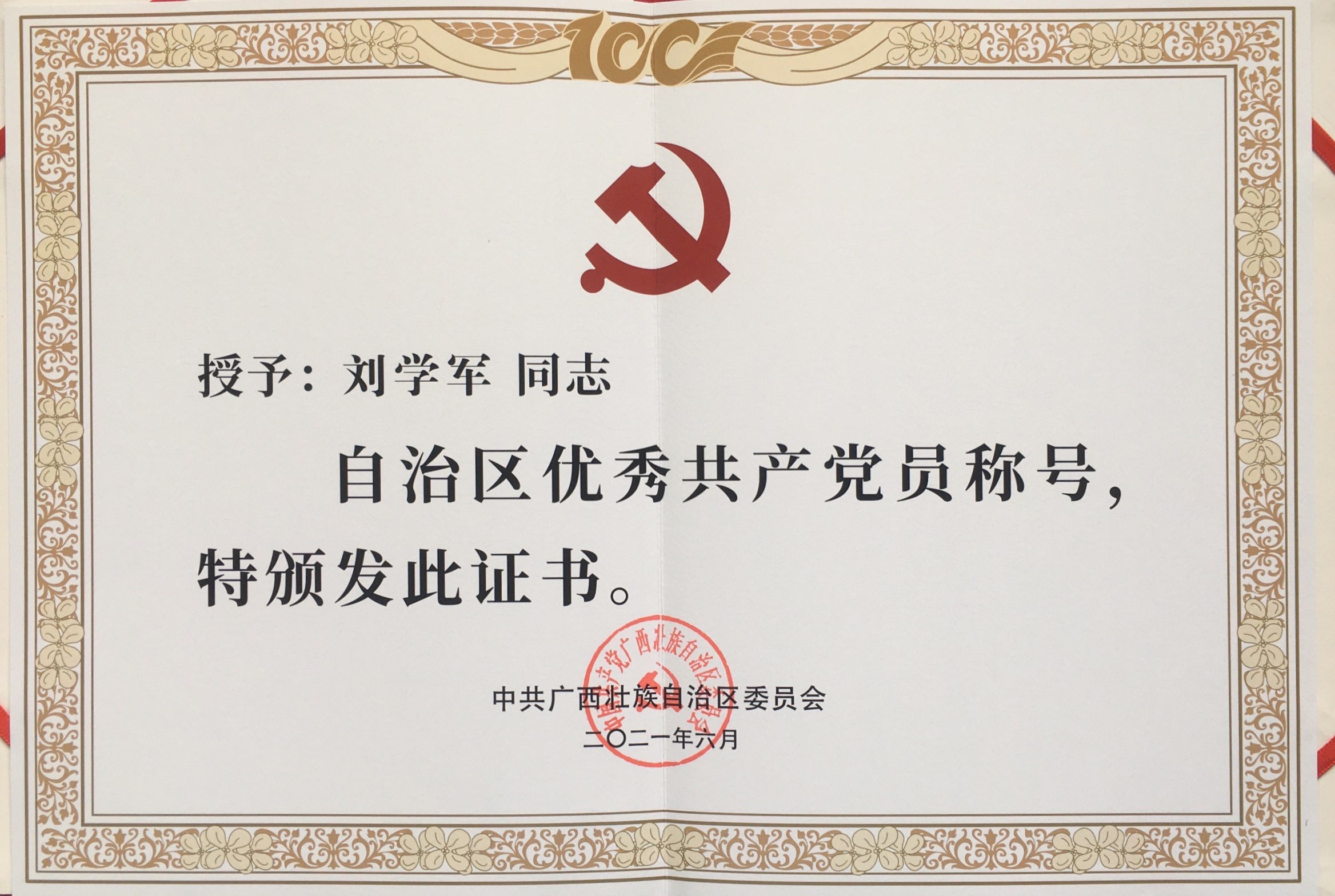 一、荣获自治区优秀共产党员年6月24日,广西壮族自治区“两优一先”表彰大会在南宁举行。汽车工程学院党总支书记、院长刘学军荣获“广西壮族自治区优秀共产党员”称号。